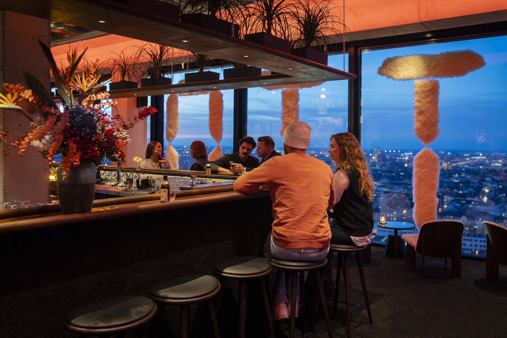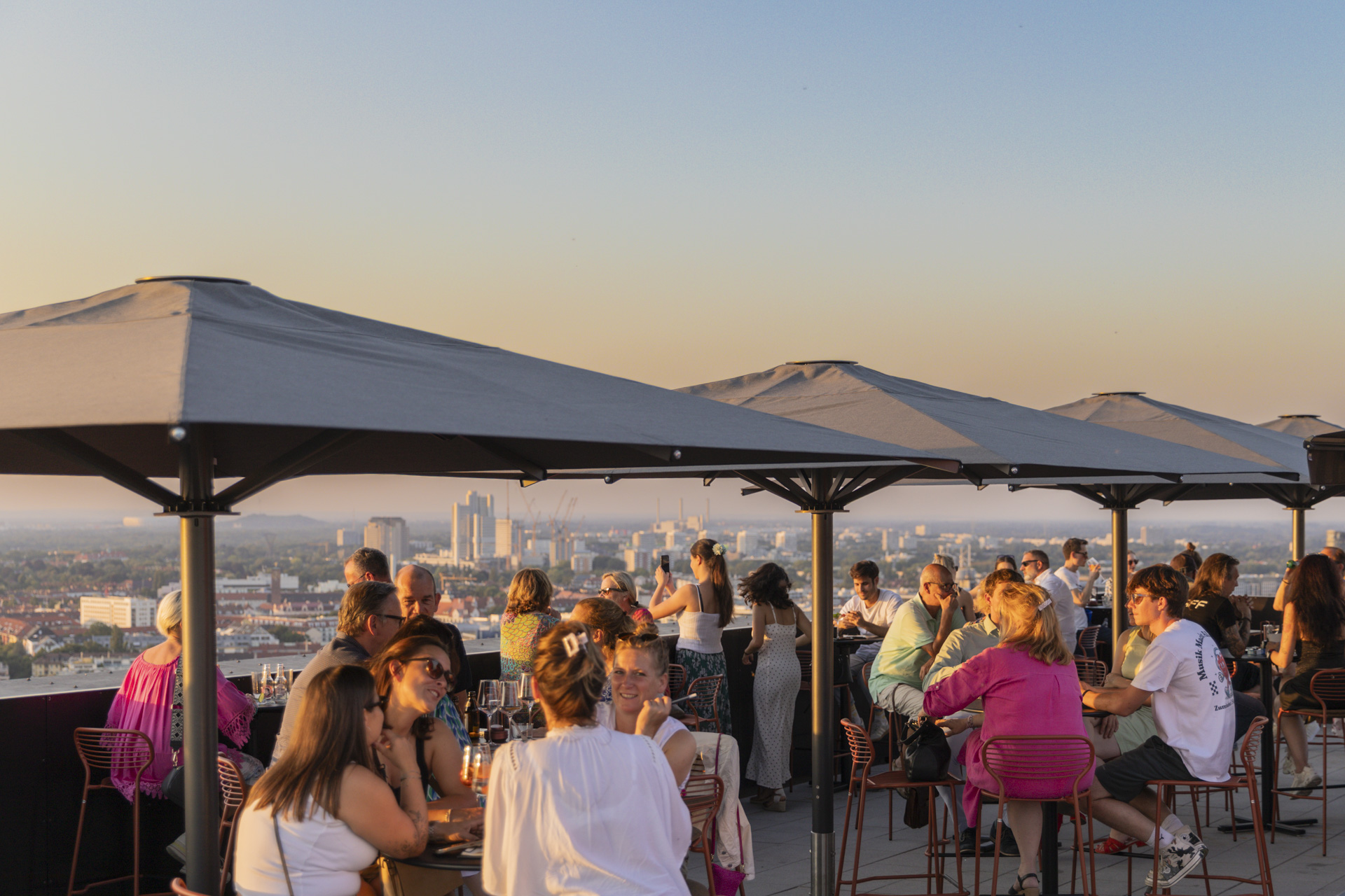 Auf der höchsten Terrasse Münchens trifft urbaner Raum auf Weite. Unten pulsiert das Werksviertel-Mitte, oben wird die Stadt ruhig. Ein Platz, an dem die Aussicht bis zu den Alpen reicht. Die Rooftop-Bar ist ausschließlich in den warmen Monaten geöffnet und nur, sofern die Windverhältnisse es zulassen. Innerhalb der regulären Öffnungszeiten ist mindestens eine der beiden Bars – entweder die Bar im Innenbereich oder die Rooftop-Bar – geöffnet.